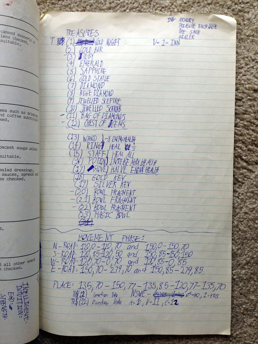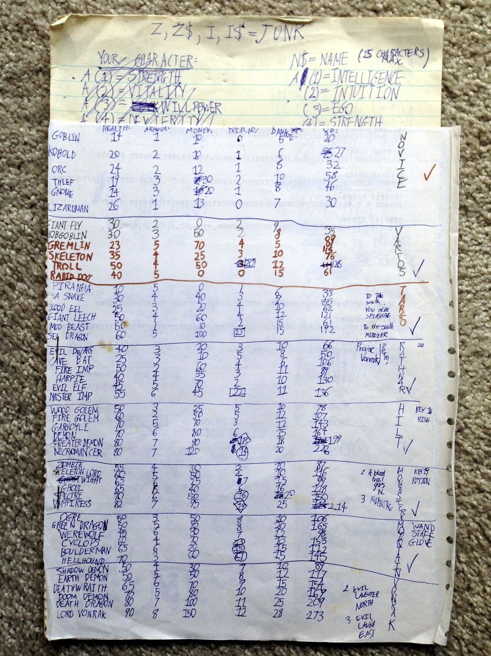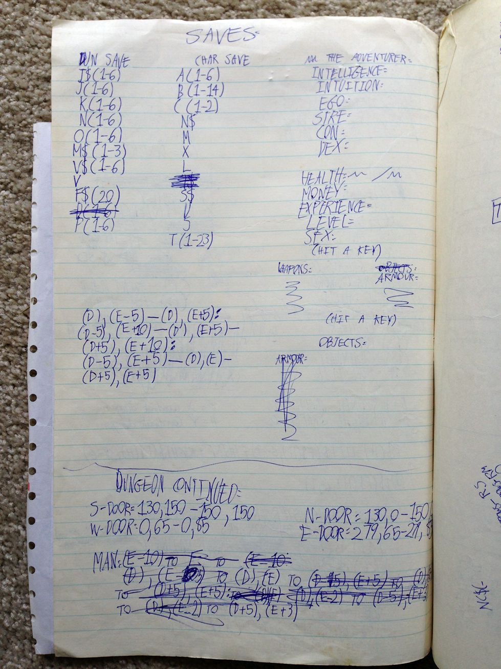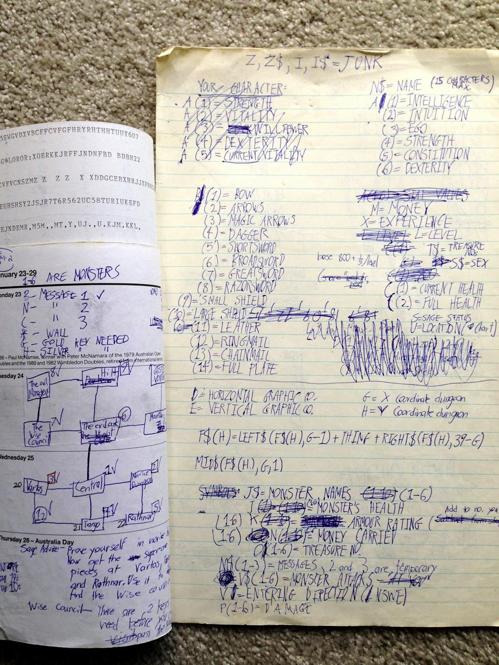 In reacquainting myself with my 1989 RPG Questor 2: Terror of Vonrak, I was surprised to discover, for the first time during the course of writing this memoir, that my remembered or imagined assessment of a game I wrote decades ago (25 years in this case) did not gel with my experience of playing it today. I expected to find the game too cheesy with fantasy cliches, too simple and too repetitive. Instead I found myself addicted to it and having a lot of fun for the several hours it took to complete from scratch. I still have some of my design notes for this game and you can view photos of them in the notes section at the bottom of this page.