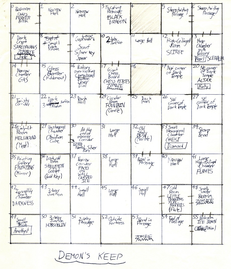 I do note that this was the last straight text adventure I wrote for the Apple II from the ground up. It's possible I was simply growing tired of the amount of work involved in each one, and each one was inevitably larger than its predecessor as I tried to outdo my past efforts. Some evidence for my "getting tired" theory is the fact that while I was digging out the notes for these games, I found a map and complete set of notes for another adventure game called Dreadkeep (would I really have made a game with so similar a name?). And I never even started programming that one.