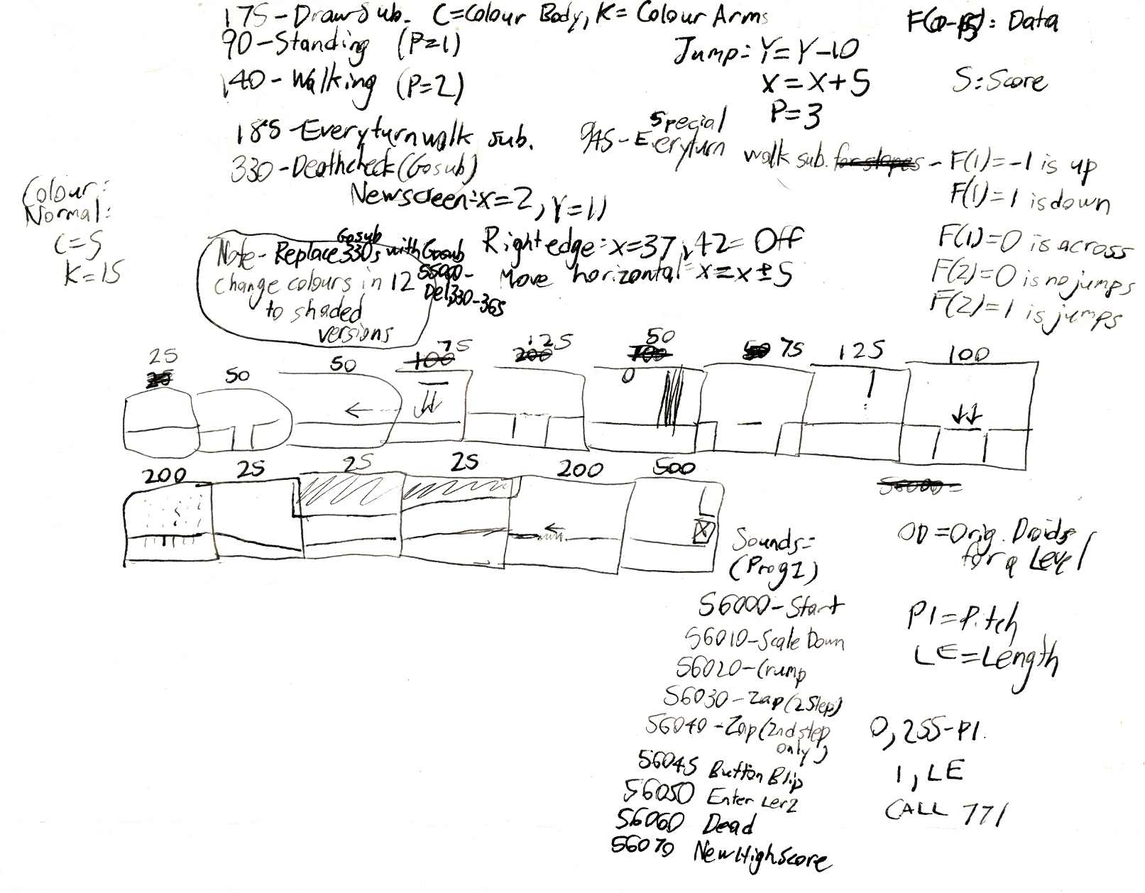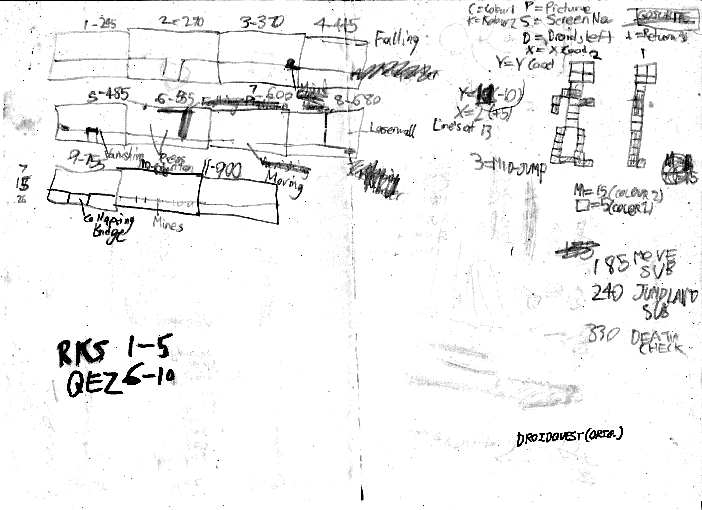 I have a couple of scans of my programming notes for this game. Click either thumbnail below for a larger view. The first page, while not very legible, is the one I originally designed the game on. I assume I made the second page when I added to the game in 1994, and it’s a lot clearer.